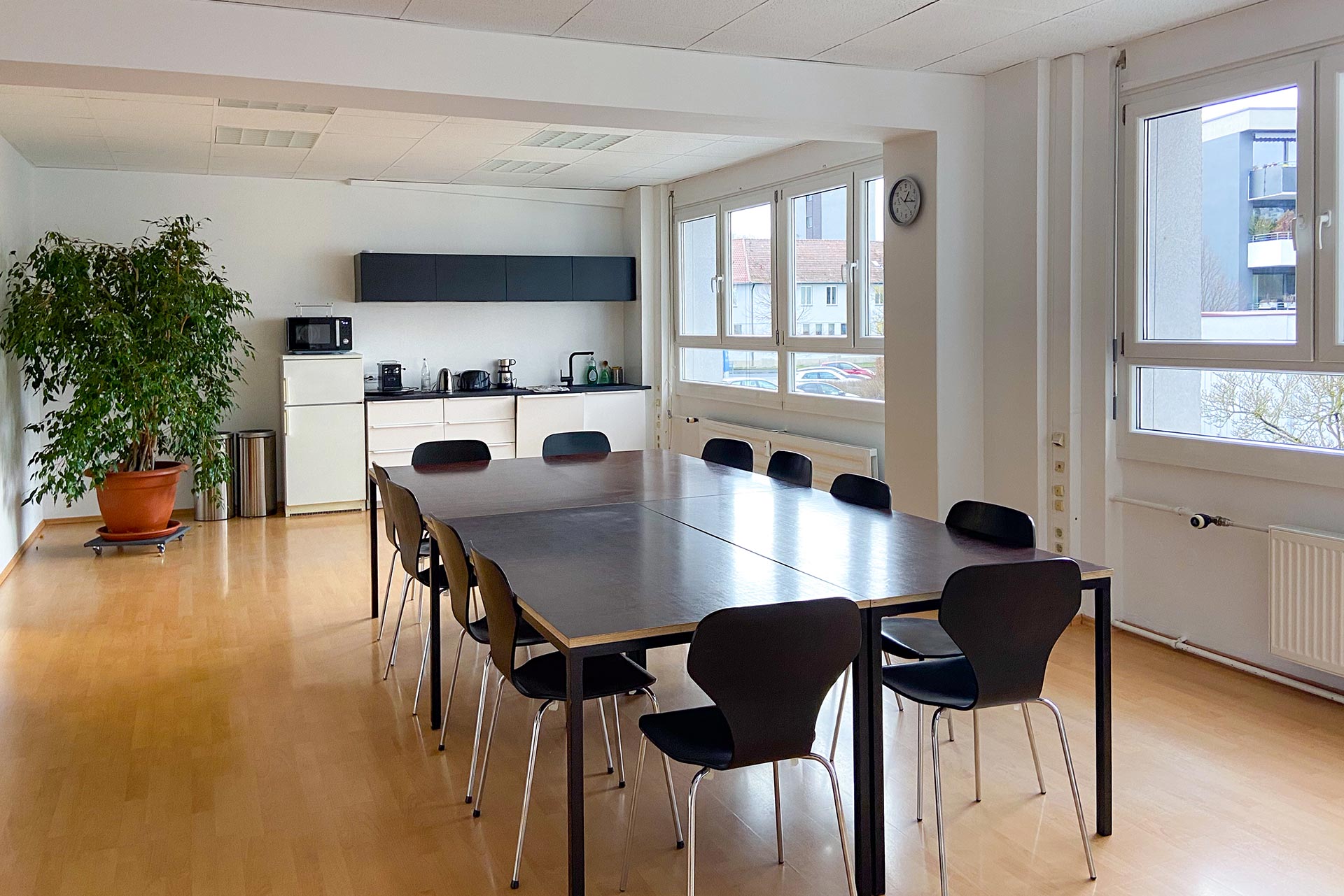 Du kannst unseren großzügigen Gemeinschaftsraum (ca. 48 qm) mitnutzen. Dieser bietet eine Teeküche und ausreichend Platz für Meetings, Besprechungen, Präsentationen oder einfach einen inspirierenden Austausch im Team.
